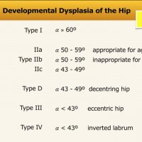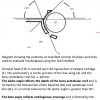 The alpha-angle, which is a measurement of the bony roof of the acetabulum, mainly determines the hip type. The normal value is greater than or equal to 60º. Note that up to the age of 3 months (13 weeks) an alpha angle below 60 degrees is acceptable.