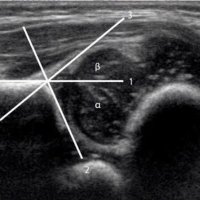 The beta angle is formed by the vertical cortex of the ilium and the triangular labral fibrocartilage. The normal value is less than 77º but is only useful in assessing immature hips when combined with the alpha angle, to differentiate between type Ia and Ib (both normal hips) and between type IIc and type D.