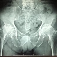 Anteroposterior pelvis radiograph reveals complete obliteration of bilateral hip joints space with associated marginal osteophyte, subchondral sclerosis and cyst formation, also deformity of femoral heads and acetabulum, in keeping with severe osteoarthritis of the hips.
