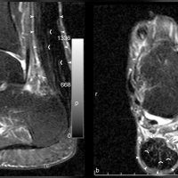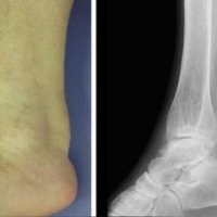 In plain radiograph, this condition appearas as soft tissue densities in the Achilles tendon.