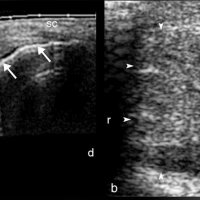 Ultrasound reveals increased AP thickness of the tendon >7 mm in males and >6 mm in females, also loss of normal tendon appearance with multiple hypoechoic foci within the tendon.