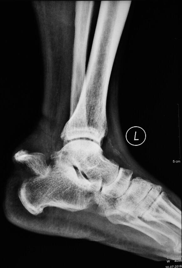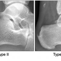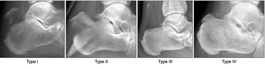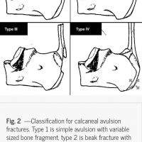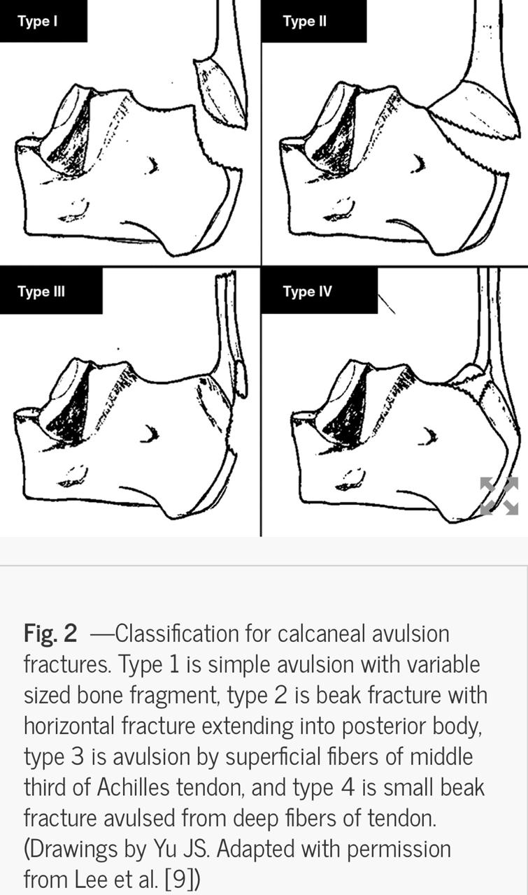There are four types of avulsion fractures: type 1, simple avulsion with a variable-sized bone fragment; type 2, beak fracture with a horizontal fracture extending into the posterior body; type 3, infrabursal avulsion by the superficial fibers of the middle third of the Achilles tendon; and type 4, small beak fracture avulsed from the deep fibers of the tendon.