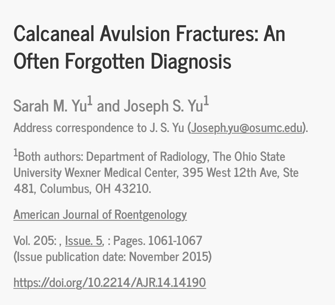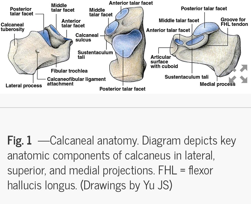 The calcaneus is the primary weight bearing bone in the heel, and its many surface contours render it a relatively difficult bone to visualize in its entirety. The stabilizing ligaments that hold the calcaneus in place occupy very specific locations, and the Achilles tendon enthesis is in a relatively constant location; therefore, avulsion fractures occur in reproducible locations.