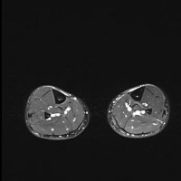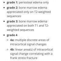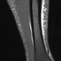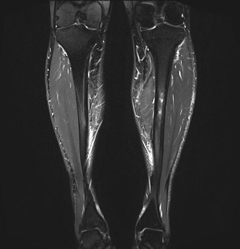 MRI is the most sensitive radiological examination (~88%). It may demonstrate a spectrum of findings ranging from normal to periosteal fluid to marrow edema to actual stress fracture. The medial cortex (+/- posterior cortex) is most commonly affected.