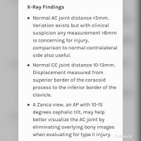 - Normal AC joint distance <5mm. Variation exists but with clinical suspicion any measurement >8mm is concerning for injury, comparison to normal contralateral side also useful.