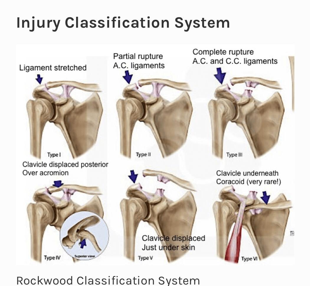 - Type V: AC tear/CC tear, CC displacement greater than twice normal joint distance, may cause tenting or ischemia of overlying skin.